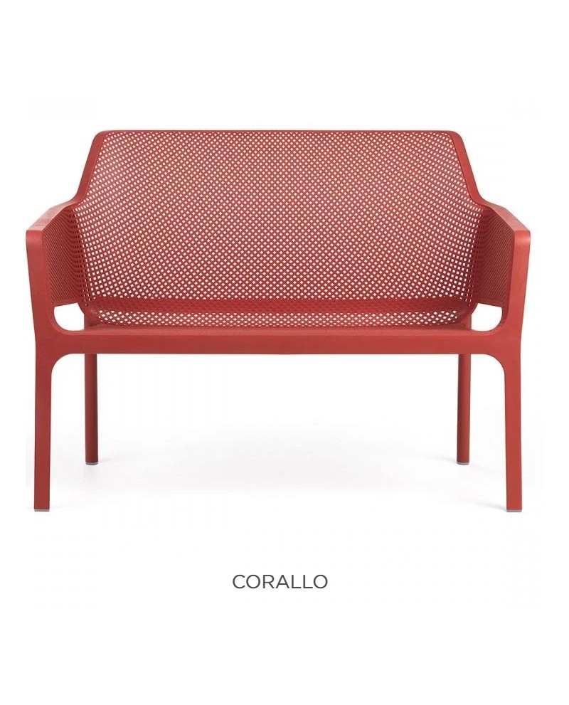 Banc NET BENCH, en polypropylène renforcé de fibres de verre pour une plus grande résistance à l'usure, coloré dans la masse et traité anti-UV, adapté à un usage intensif, résine recyclable, patins anti-dérapants, 6 coloris, coussin de 7 cm (en option). Fabrication Italienne.