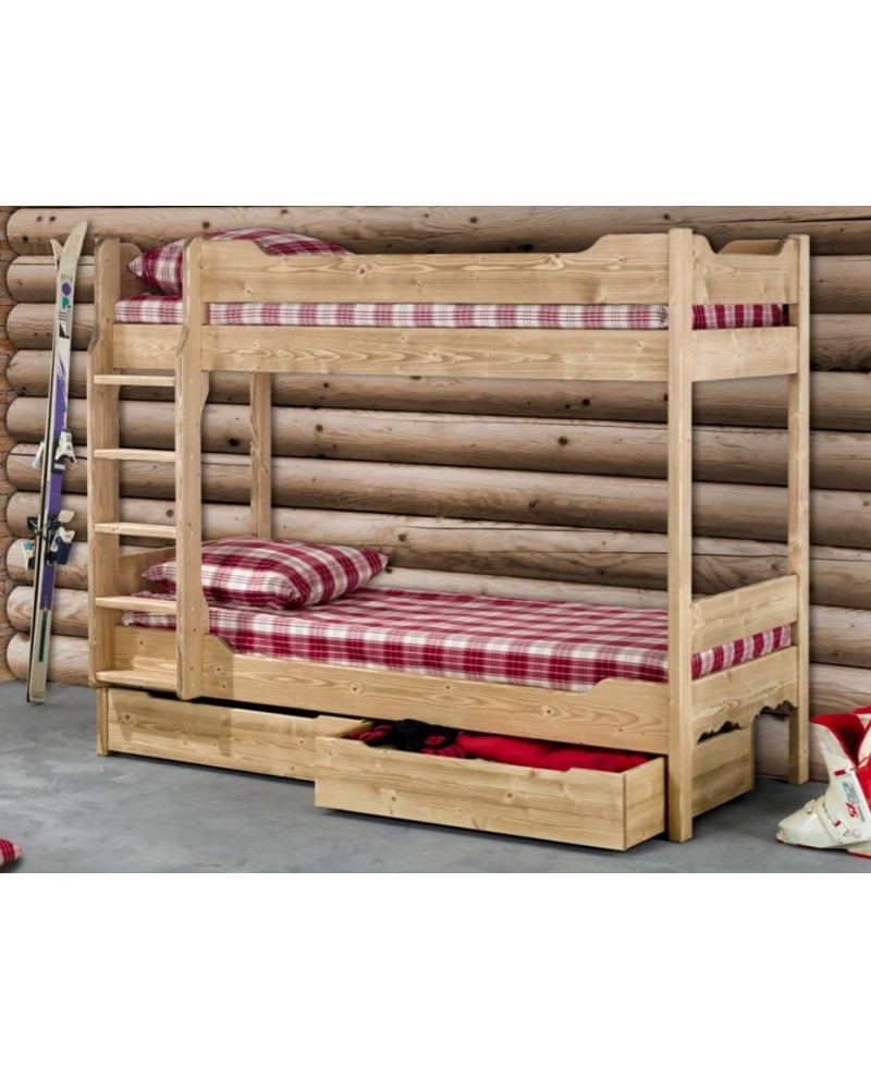 lit superposés CHATEL en bois massif, solide et fonctionnel, conformes aux normes en vigueur, 4 dimensions, plusieurs finition, bois brut, ciré brossé, vernis naturel ou laqué, produit à monter, hauteur totale 162 cm, espace utile entre les lits 80 cm, Possiblilté de le compléter avec des tirois