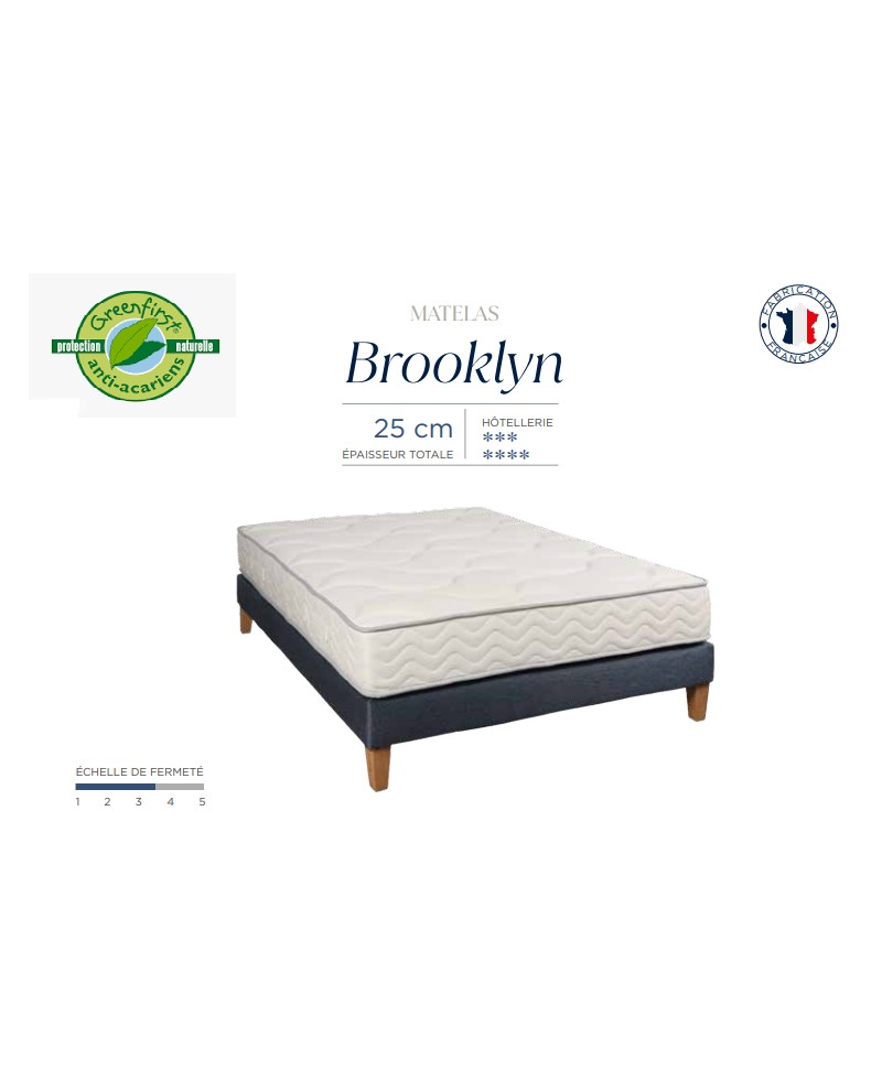 Matelas à ressorts ensachés Brooklyn, garanti 5 ans, (1026 ressorts en 160 x 200) épaisseur 26 cm, non feu composé de 7 zones de confort et d'une bande AIR permettant une ventilation maximale, produit de qualité, fiable confort ferme. Traitement anti-punaises de lit. Fabrication Française.