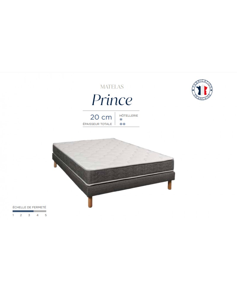 Matelas à ressorts ensachés Prince, garanti 5 ans, (690 ressorts en 160 x 200) épaisseur 20 cm, non feu composé de 5 zones de confort ventilation naturelle et soutien durable, produit de qualité, fiable confort ferme, accueil moelleux, matelas réversible 2 faces, existe aussi en DUO relié par ZIP ou VELCRO. Fabrication Française.