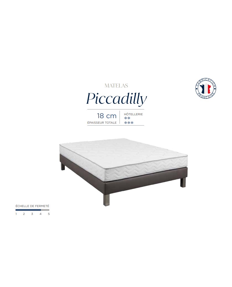 Matelas PICCADILLY hôtellerie en mousse polyuréthane haute résilience 35 kg/M3, de 18 cm d'épaisseur, réversible. Il répond aux normes anti-feu NF EN 597-1 et NF EN 597-2. Ce matelas est fabriqué en France et garanti 5 ans, et se décline aussi en DUO relié par Zip ou Velcro.
