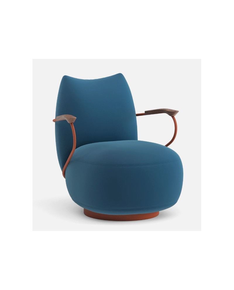 Fauteuil bas compact, très design, hauteur totale 86 cm, hauteur d'assise 42 cm, base en métal laqué, accoudoirs en chêne, nombreux tissus.